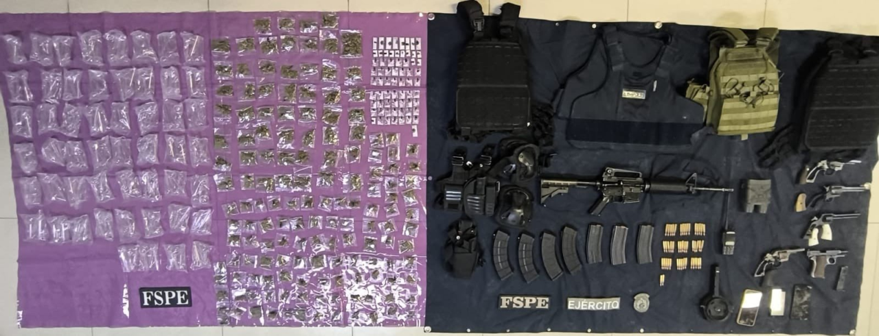 Durante el despliegue, las autoridades aseguraron siete armas de fuego, una larga y seis cortas; nueve cargadores y 56 cartuchos útiles; así como 419 dosis de marihuana y 132 dosis de metanfetamina. Además, fue asegurado un vehículo con reporte de robo, así como seis motocicletas, una de ellas con reporte vigente, además de equipo táctico diverso.